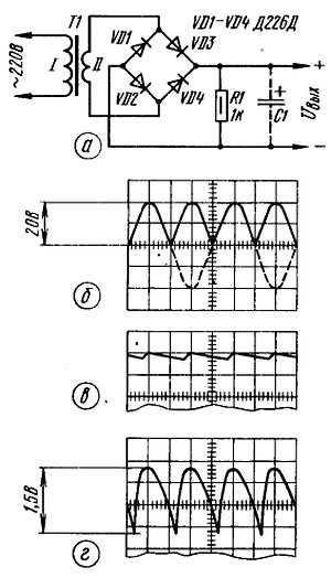 Подключите ко вторичной обмотке четыре диода (рис. 11, а; — двухполупериодиый выпрямитель, собранный по мостовой схеме, и резистор нагрузки R1, а к резистору подсоедините щупы осциллографа («земляной» щуп — к нижнему по схеме выводу резистора). На экране осциллографа будут только положительные полупериоды синусоидального напряжения, следующие с частотой вдвое большей частоты сетевого напряжения. Иначе говоря, отрицательные полупериоды «перевернулись» и заняли место между положительными (рис. 11, б).