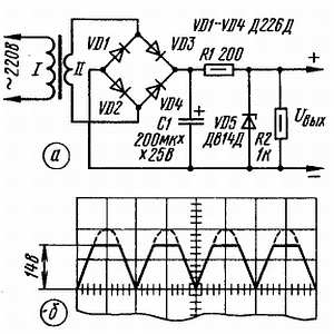 Для него понадобится стабилитрон VD5 и балластный резистор R1. Причем напряжение на нагрузке (резистор R2) будет определяться только используемым стабилитроном. К примеру, для указанного на схеме стабилитрона Д814Д оно составит 11,5…14 В (таков разброс напряжения стабилизации в зависимости от конкретно установленного экземпляра), для Д814Г — 10…12 В, для Д814В — 9…10,5 В и т. д.