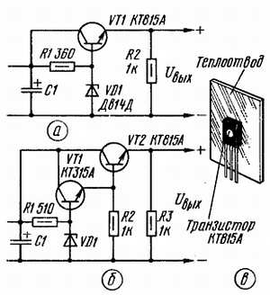 При больших токах нагрузки транзистор выбирают с возможно большим коэффициентом передачи тока. Если же в наличии лишь транзистор с малым коэффициентом передачи, добавляют к нему маломощный транзистор (рис. 13, б) — и в итоге получается составной транзистор с большим коэффициентом передачи тока. Правда, в этом случае напряжение на выходе будет уже отличаться от напряжения на стабилитроне на 1…1.4 В. В любом варианте мощный транзистор нужно укрепить на теплоотводящей пластине из дюралюминия, алюминия или меди толщиной 2…3 мм и общей площадью поверхности не менее 15 см2 (рис. 13, в).