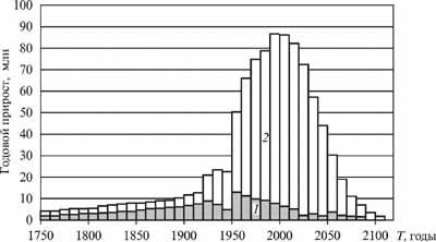1 -- развитые страны, 2 -- развивающиеся страны. Годовой прирост населения мира усреднен за 10 лет. Видно уменьшение скорости роста при мировых войнах и демографическое эхо войны в начале XXI в.