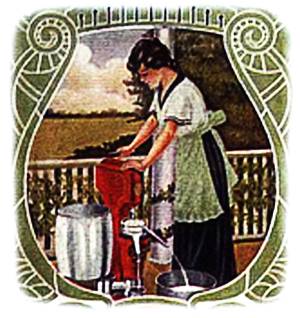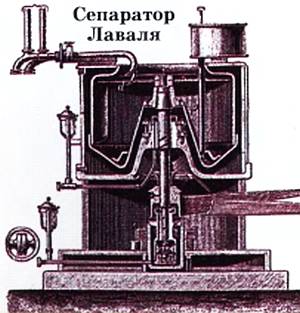Шведский изобретатель Густаф де Лаваль усовершенствовал способ Лефельда и создал сепаратор. Это был вращающийся сосуд со вставкой особой формы. В него непрерывно заливали молоко и получали на выходе поток сливок и поток тощего молока. Производительность процесса увеличилась в сотни раз. Любопытно, что происходившее в сепараторе разделение приводило к тому, что все случайные примеси и даже бактерии оставались в тощем молоке, а сливки становились идеально чистым, долго хранимым продуктом. Сепараторы выпускались как большие — для молокозаводов, так и крохотные, с ручным приводом. На старинном рисунке вы видите, как шведская хозяйка готовит сливки для своей семьи.