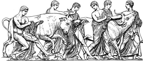 Легкая расцветка оживляла мрамор Парфенона. Красный фон подчеркивал белизну фигур, четко выделялись синевой узкие вертикальные выступы, отделявшие одну плиту фриза от другой, ярко сияла позолота. Позади колонн, на мраморной ленте, опоясывающей все четыре фасада здания, была изображена праздничная процессия. Здесь почти нет богов, а люди, навек запечатленные в камне, двигались по двум длинным сторонам здания и соединялись на восточном фасаде, где происходила торжественная церемония вручения жрецу одеяния, сотканного афинскими девушками для богини. Каждая фигура характерна своей неповторимой красотой, а все вместе они точно отражают подлинную жизнь и обычаи древнего города.