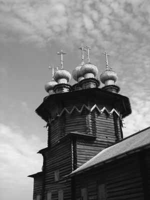 К югу от Преображенской высится стройная церковь Покрова, девять глав которой зрительно перекликаются с главами Преображенского храма, сообщая всему ансамблю необходимое единство. Внешне не схожие памятники имеют много общего. И в том, и в другом случае монументальный бревенчатый свод использовался народными зодчими как своего рода пьедестал для пышного многоглавия. Но Покровская церковь совсем иная, образный лад ее настроен совсем на другую ноту. Девять ее глав образуют поразительную по красоте ажурную корону – легкую, женственно-изящную, пронизанную светом и воздухом и в то же время по-своему торжественную, царственно-величественную: словно русская красавица в шитом жемчугом уборе.