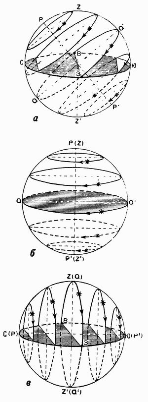 Рис. 14. Видимое движение звезд для наблюдателя: а — на средних широтах; б — на полюсах Земли; в — на земном экваторе