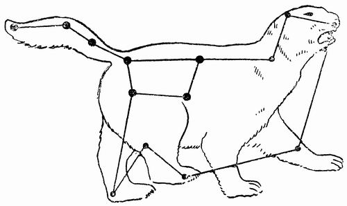 В первом из них (рис. 15) отправным пунктом для отыскания многих аэронавигационных звезд служит созвездие Большой Медведицы, семь наиболее ярких звезд которого образуют характерную фигуру ковша или кастрюли. По древнему преданию, Большая Медведица (рис. 16) — это превращенная богиней Герой в медведицу Каллисто, дочь царя Ликаона, чуть не затравленная на охоте псами пастуха Волопаса. Созвездия Большой Медведицы, Волопаса и Гончих Псов расположены поблизости друг от Друга. Древние арабы называли созвездие Большой Медведицы Семибратием.