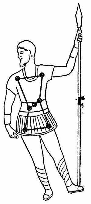 На втором участке неба (рис. 17) находится одно из красивейших созвездий—Орион. Четыре его яркие звезды образуют большой четырехугольник, внутри которого близко друг к другу расположены еще три звезды — пояс Ориона. По древнегреческому мифу, Орион — великан-охотник, наделенный исключительной красотой (рис. 18).