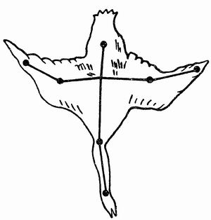 К созвездию Лиры примыкает крестообразная фигура созвездия Лебедя (рис. 20). В вершине креста находится звезда Денеб, которая вместе с Вегой и Альтаиром — наиболее яркой звездой созвездия Орла, напоминающего фигуру самолета, — образует почти равнобедренный треугольник.
