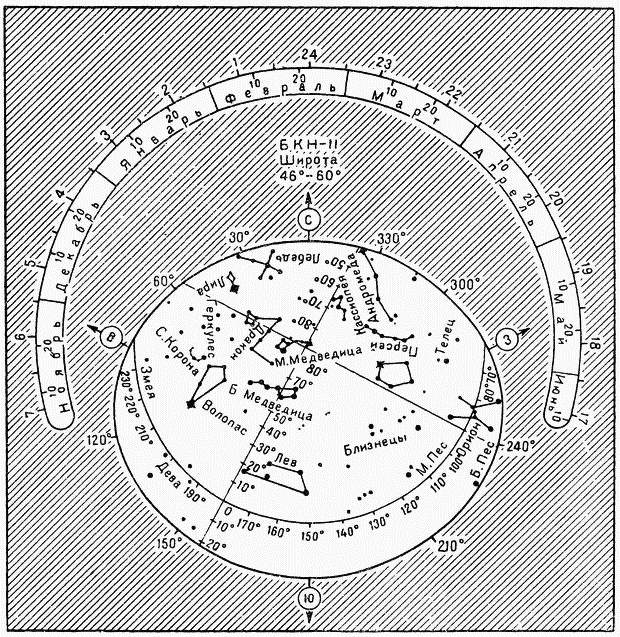 В авиационной астрономии применяется подвижная карта звездного неба, известная под названием бортовой карты неба — БКН (рис. 22). Она состоит из неподвижного основания, на котором вращается вокруг полюса мира звездная карта со звездами до четвертой величины, и накладного листа с вырезом, изображающим горизонт для заданной широты места. На звездной карте нанесены четыре круга склонений, которые соответствуют прямым восхождениям 0, 90, 180 и 270°, и небесный экватор со шкалой прямых восхождений через каждые 10°. Два круга склонений имеют шкалу через 10°. По краю овального выреза нанесены риски, показывающие положение точек севера, юга, востока и запада, а также шкала азимутов через 30°.