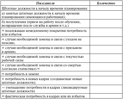 Балансовый метод основывается на взаимной увязке ресурсов, которыми располагает организация, и потребностей в них в рамках планового периода. Если ресурсов по сравнению с потребностями недостаточно, то происходит поиск их дополнительных источников, позволяющих покрыть дефицит. Необходимые ресурсы можно привлекать с внутреннего или внешнего рынка труда. Алгоритм расчета фактической потребности в персонале представлен в табл. 4.1.
