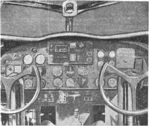 Приборная доска аэроплана. Справа и слева видны штурвалы двойного управления. На доске посредине вверху — робот-пилот.