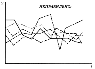 Рис. 15. Здесь слишком много кривых, для того чтобы быстро проследить каждую из них взглядом. Не надо требовать от читателя очень уж большого усердия, не надо перекладывать на него часть Вашей работы