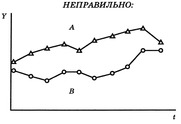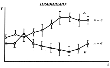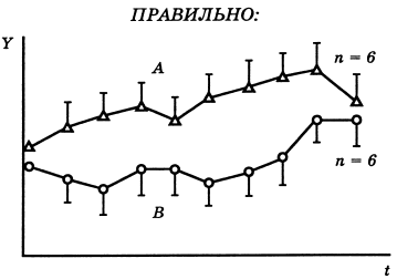Рис. 18. Представлены только средние, статистический разброс не обозначен, данные о числе объектов в каждой выборке также отсутствуют. Суждение о различии между A и B – принципиально невозможно. t – время