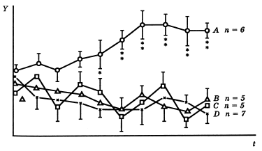 Рис. 16. Если на рисунке только две кривых, читатель легко оценит динамику обеих. Представлены средние ± ошибки средних; n– число объектов (больных, лабораторных животных, опытных образцов и т. п.); t – время. Звездочки соответствуют статистической значимости различий между Aи B: *р < 0,05; **р < 0,01. Никто не запрещает Вам вынести остальные кривые в другой рисунок или сделать серию рисунков, в каждом из которых новая кривая будет дана в сравнении с одной и той же повторяющейся кривой, например A и B, A и C, A и D и т. д.