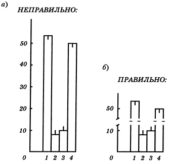 Рис. 20. Длинные столбики (а), если изображать их полностью, занимают слишком много места, ничего не добавляя к наглядности рисунка. Лучше вырезать их середину (б)