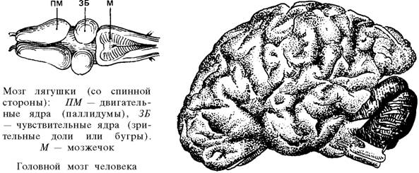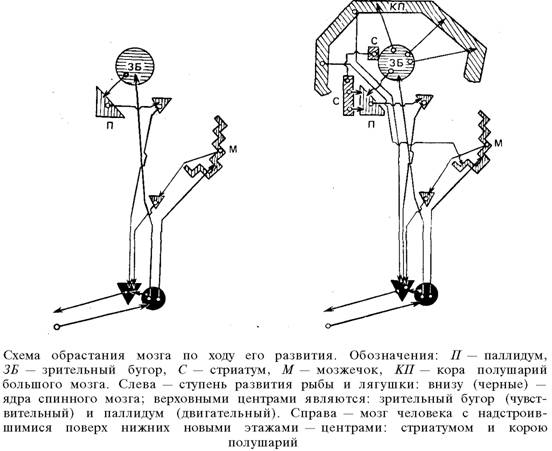 Во-первых, верно, что мозг человека — настоящее многоэтажное сооружение, этажи которого возникали поочередно, один за другим. В очерке III мы проследили более или менее подробно историю их появления на свет. Низовой отдел взрослого человеческого мозга составляют нервные ядра, соответствующие паллидумам лягушки — ее верховным мозговым образованиям[27]. Подчиняя их себе, выше их располагается у человека этаж стриатума, возглавляющего двигательные мозговые устройства у пресмыкающихся и у птиц. Еще выше находится в мозгу человека пирамидная двигательная система (пдс) коры полушарий мозга. Это образование возникло еще позднее — только у млекопитающих. Кора мозговых полушарий резко отличается по виду от всех более древних образований мозга. Она выглядит, как известно, одним сплошным слоем, правда смятым и «сплоенным» извилинами и бороздами. Но эта смятость коры получилась только потому, что кора стремилась разрастись как можно шире, а тесная костяная коробка черепа препятствовала ей в этом. Если же отвлечься от извилин и борозд и разгладить кору полушарий мысленным утюгом, то перед нами будет один однородный на вид широкий слой, который, подобно плащу, обволакивает со всех сторон большие полушария мозга[28]. Однако если подойти к коре с точки зрения ее внутреннего, исторически сложившегося устройства, то она окажется совсем не такой однородной. Самые древние (чувствительные) зачатки коры появились уже в эпоху пресмыкающихся; они уцелели и в мозгу человека, сохранив в нем и свое строение, и свои функции. В последующем у птиц, а затем у млекопитающих время от времени возникали все новые и новые участки коры, укладывающиеся друг подле друга, точно в мозаике. Каждый из таких участков приносил с собою возможность каких-нибудь новых отправлений, и каждый сохранился более или менее точно с тою же «профессией» и в мозгу человека. Все они не отличимы один от другого по внешнему виду, и только микроскоп вскрывает их глубокие различия. Несмотря на то, что они все укладывались в развивавшейся коре рядом, сливаясь краями друг с другом, и здесь, как и в более древних частях мозга, более новые образования подчиняли себе более старые. За время эволюции млекопитающих, уже после появления пдс, в мозгу успели сформироваться еще по крайней мере две двигательные системы, полностью корковые и возглавляющие собою пдс вполне подобно тому, как возглавляют друг друга последовательные этажи в древней экстрапирамидной двигательной системе (эдс). Самая верхняя и новая из этих систем имеется, несомненно, только у человека, составляя его исключительное преимущество перед всеми животными. Эти несколько этажей, скрытые в однослойной на вид коре и все вместе возвышающиеся над многоэтажной постройкой эдс, образуют вкупе с нею целый мозговой небоскреб. Каково значение и смысл такого многоэтажного сооружения, увидим дальше.