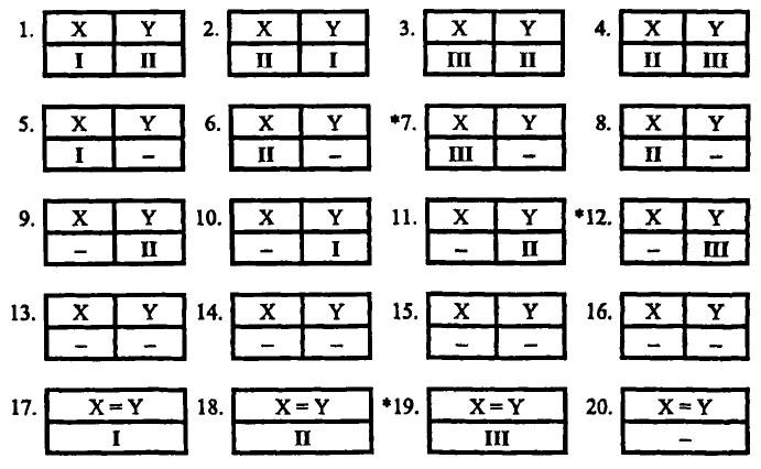Применение к стандартной двухактантной диатезе трех вышеуказанных операций дает 20 следующих вариантов диатезы (строка 1 представляет все мыслимые перестановки ГСинт-актантов; строки 2–4 получаются из строки 1 путем суппрессии сначала левого, потом правого, а потом обоих ГСинт-актантов; строка 5 соответствует идентификации обоих СемА; никакая операция не применяется повторно):