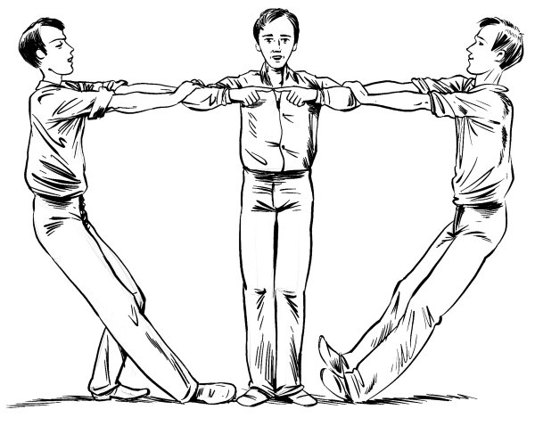 Приставьте указательные пальцы ваших рук друг к другу, как показано на рисунке, и предложите товарищу разнять эти пальцы, ухватив вас за локти. Не правда ли, очень легкое дело? А между тем товарищ ваш не справится с этой задачей, даже если он сильнее вас. Без большого напряжения вы сможете противостоять усилиям даже двоих товарищей.