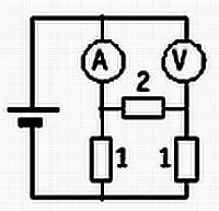 7. Найти показание амперметра в схеме на рисунке, если вольтметр показывает 6 В? Сопротивления резисторов указаны в Омах. Измерительные приборы можно считать идеальными.