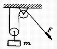 10. Груз массой m = 20 кг можно поднимать с помощью системы из подвижного и неподвижного блоков. С какой постоянной силой F надо тянуть веревку, чтобы за время подъема t = 0,5 c груз из состояния покоя достиг скорости V = 2 м/с? Массами веревки, блоков и трением в осях блоков пренебречь.