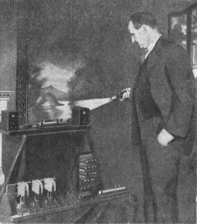 В спокойном положении контактная ручка распределителя лежит на нулевом контакте. Предположим, что нам необходимо пустить в ход мотор номер второй. Тогда мы освещаем два раза фотоэлектрический элемент распределителя. Изобретатель это делает с помощью карманного электрического фонарика. При каждом освещении ручка передвигается на следующий контакт. При первом освещении ручка переходит с нулевого контакта на первый, при втором освещении — с первого контакта на второй.