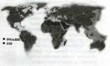 С начала века потребление воды выросло более чем в шесть раз. Свыше половины всего объема расходуется сегодня в азиатских странах. Если потребление воды в Европе и Северной Америке будет расти все еще очень медленно, то в Африке, Южной Америке и Азии ожидаются высокие темпы прироста расхода. Во многих странах расходуется больше воды, чем имеется в наличии для устойчивого пользования. Если в какой-то стране наличие запасов воды не достигает 1000 м3 на душу населения в год, то это означает ее нехватку, что наносит ущерб экономическому развитию и здоровью людей. В 1990 году от нехватки воды страдали 20 стран. В 2025 году их число превысит 30. В зависимости от темпов роста населения число страдающих от этого людей вырастет с 132 (1990 г.) до 653-904 миллионов в 2025 году.