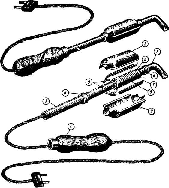 Внешний вид и детали электропаяльника показаны на рисунке 77. Он имеет сердечник 1, изготовленный из прутка красной меди, кожух, состоящий из двух крышек 2, металлическую трубку 3, в которую вставляется сердечник. Один ее конец закрепляется в деревянной ручке 4, а на свободном конце укреплен нагревательный элемент, состоящий из нихромовой спирали 5, изолированной от трубки и от кожуха слюдяными прокладками. Крышки кожуха скрепляются с торцов стяжными кольцами 6. Выводы от спирали присоединяются к свободным концам соединительного шнура 9, пропущенного сквозь отверстие в ручке и заделанного в вилку. Спираль намотана в два слоя 7 и 8.