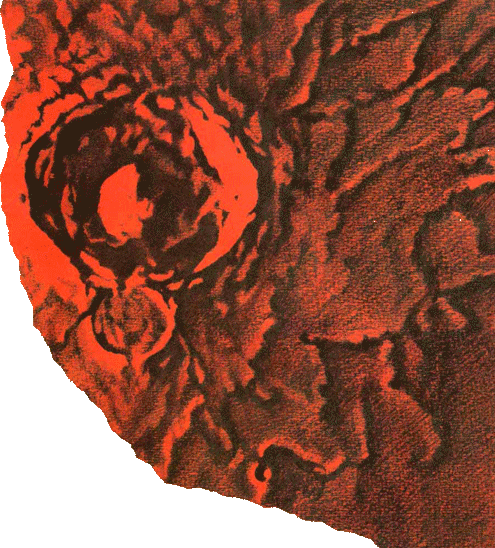 Но на красной планете в приэкваториальной области можно видеть котловины гораздо крупнее, поперечником в десятки и сотни километров, дно которых как бы обрушилось в глубинные пустоты.