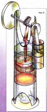 Она имеет рабочий цилиндр и сообщающийся с ним особый цилиндр, в котором происходит нагревание и охлаждение воздуха. Дно его подогревается горелкой, а верхняя крышка охлаждается водой. В этом цилиндре и перемещается вытеснитель — цилиндр, расположенный внутри основного, с зазором между стенками. Когда он движется вниз, воздух, касаясь раскаленного дна, нагревается, расширяется. Происходит рабочий ход.