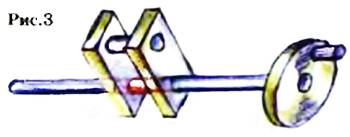 В весьма обстоятельной книге С. Баранова «Действующие модели тепловых машин», ОНТИ, 1936 г., модель воздушного теплового двигателя рассматривается как очень простая, потому, видимо, ей отведено лишь несколько страниц без рабочего чертежа. Изготовление модели следует начать с вычерчивания эскиза в масштабе применительно к размеру имеющихся заготовок. Коленчатый вал делается из стали-серебрянки диаметром 4–6 мм. Для этого на стержень напаяйте щеки кривошипов (рис. 3) со вставленными в них штифтами.