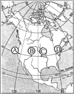 10. Определите, в каком из обозначенных буквами на карте Северной Америки пунктов Солнце будет находиться ниже всего над горизонтом в то время, когда на Гринвичском меридиане 16 ч. утра. Ход ваших рассуждений запишите.