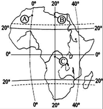 13. Определите, в каком из пунктов, обозначенных буквами на карте Африки, 18 июня Солнце раньше всего по времени Гринвичского меридиана поднимется над горизонтом. Ход ваших рассуждений запишите.