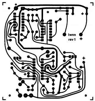 Рис 12.6. Чертеж металлизации для простой односторонней платы ПС. Этот «позитивный слой» выполнен фотографическим уменьшением майларового рисунка, сделанного вручную в масштабе 2:1. Схемная плата размером 82,15x87,5 мм содержит 4 ИМС, 24 резистора, 11 конденсаторов, 5 диодов, 1 триммер и 1 пьезозуммер.