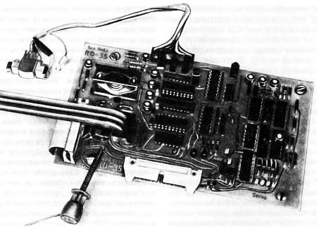 Рис. 12.7. Печатная плата цифрового магнитного регистратора, на которой осуществлено несколько видов внешних соединений. Магнитная головка присоединена через однорядный разъем (который соответствует ряду штырьков для накрутки), а другие цепи — с помощью многоконтактных разъемов и разъема с двухрядной вставкой DIP (впаивается на место ИМС). Щуп показан подсоединенным к выводу контрольной точки. На примере этой платы можно видеть установку элемента с теплоотводом (слева вверху), индикатора логических состояний (справа вверху), миниатюрных однооборотных потенциометров и монтаж резисторов «в линию».