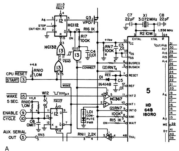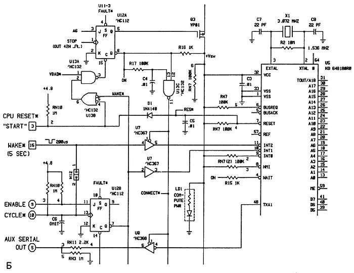 Рис. 12.8. Часть сложной схемы, по которой сделана плата ПС, изображенная на рис. 12.11 а — выполнено вручную чернилами на чертежном столе; б — машинный чертеж, выполненный с использованием программ ввода описания принципиальной схемы в фирме Case Technologies.