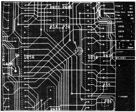 Рис. 12.9. Фотография системы проектирования платы ПС (Racal-Redac), показывающая ручную «правку» треков маршрутизации. Курсор, управляемый через иголки графического планшета, указывает схемный трек, который следует модифицировать. Дисплей цветной, изменяя цвет и интенсивность, обозначают различные слои, контуры элементов, надписи и т. п.