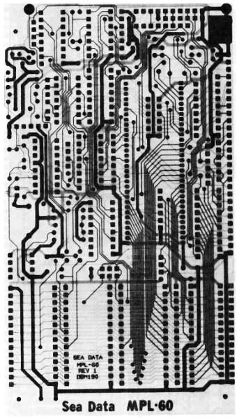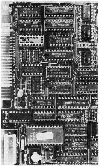 Рис. 12.11. Законченная двусторонняя плата микропроцессора. При проектировании следовали норме 12–12. Более высокую плотность элементов можно достичь, только ужесточая норму проектирования или, лучше, увеличивая число слоев.