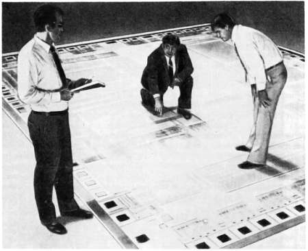 От принципиальной схемы до получения законченной монтажной ПС проходит несколько стадий. Имея вначале только принципиальную схему, вы обычно разрабатываете пробный карандашный эскиз размещения компонентов и межсоединений. В конце концов получается карандашный рисунок, на котором все вместе — компоненты и межсоединения - располагаются в рабочем виде. На его основе вы изготавливаете плакат, на котором показаны точно выстроенные в ряды контактные площадки и полоски межсоединений. Для выводов ИМС и транзисторов, а также межсоединений и контактов разъемов используются предварительно разрезанные шаблоны, так как они имеют стандартные местоположения и размеры.