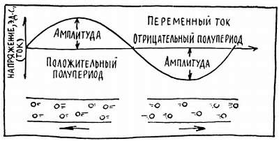 Знакомясь с микрофоном и громкоговорителем, мы с вами как-то незаметно ввели еще одно действующее лицо — переменный ток. Рассматривая карманный фонарик, мы говорили, что в его цепи течет постоянный ток. При этом имелось в виду, что этот ток всегда течет в одну и ту же сторону и величина тока также остается неизменной. В карманном фонаре иначе и быть не могло — источником тока там является батарейка, которая всегда дает постоянную э. д. с.