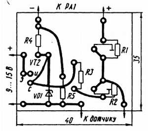 Стрелочный индикатор прибора — микроамперметр на ток 50 мкА с нулем посередине шкалы. Датчик помещен в металлическую трубку, герметизированную с обоих концов. Провод, соединяющий датчик с измерительным мостом, должен быть экранированным. Остальные детали термометра смонтированы на печатной плате, чертеж которой приведен на рис. 30.