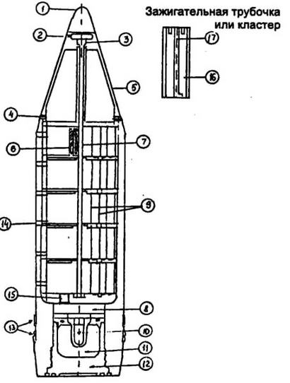 1 - дистанционный взрыватель типа 91; 2 - винт установки взрывателя на заданное время; 3 - воспламенитель (2 кг); 4 - винт для крепления головной части снаряда; 5 - головная часть; 6 - кластер; 7 - запальный стержень- замедлитель; 8 - выбрасывающий заряд в корпусе; 9 - скобы; 10 - детонатор; 11 - главный заряд; 12 - донная крышка; 13 - ведущие пояски; 14 - вращающаяся заклепка; 15 - заряд замедленного действия; 16 зажигательная смесь; 17 - центральный быстрогорящий огнепроводный шнур