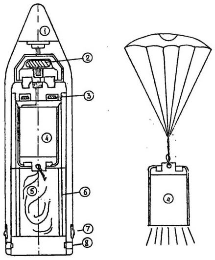 1 - головной дистанционный взрыватель типа 91; 2, 3 - первый и второй выбрасываемые заряды; 4 - горящий порох; 5 - парашют; 6 - выбрасываемый контейнер; 7 - ведущие пояски; 8 - срезаемые штырьки