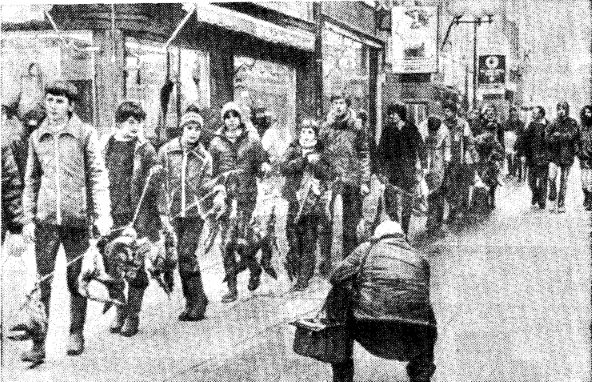 Рис. 41–42. «Нефтяной чумой» называют загрязнение оперения птиц нефтью, которая остается на поверхности моря, например после аварий танкеров. На фото — погибшие птицы. Вверху — загрязненная нефтью птица, вынутая из воды. Внизу — демонстрация протеста против загрязнения окружающей среды. Демонстранты несут веревку с привязанными к ней трупами птиц, погибших в результате загрязнения моря нефтью. (Фото ?kapia, Франкфурт-на-Майне.)
