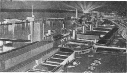 Звезду Арктур избрали не случайно. Свет, пробегая в секунду 300 000 км, идет от нее к нам ровно сорок лет. Значит, тот луч звезды, который открыл выставку 1933 г., отправился в путешествие по мировому пространству в 1893 г. А как раз именно в этом году в Чикаго была предшествующая большая выставка — Колумбийская. Свет Арктура перекинул как бы мост между двумя этими выдающимися выставками.
