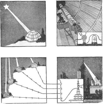 Звезда Арктур открывает выставку в Чикаго в 1933 г. Слева вверху свет Арктура попадает в обсерваторию. Справа вверху, пройдя через телескоп, свет звезды падает на фотоэлемент. Слева внизу четыре обсерватории по телефонным проводам передают ток, вызванный Арктуром, на выставку — внизу справа.