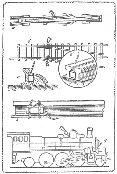 а — как подрывают крестовину; б — как подрывают стрелку; в, г — как подрывают рельсы; д — как подрывают паровоз