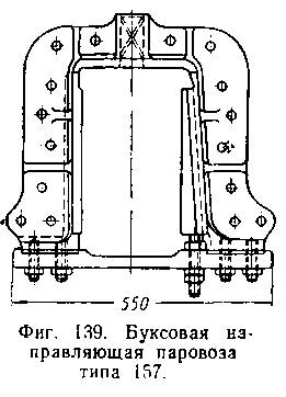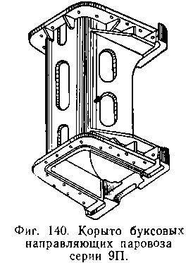 Буксовые направляющие изготовляются отдельно или в общем корпусе (фиг. 139). Последнее устройство более прочно, так как служит и для укрепления рамы паровоза в месте, ослабленном буксовым вырезом.