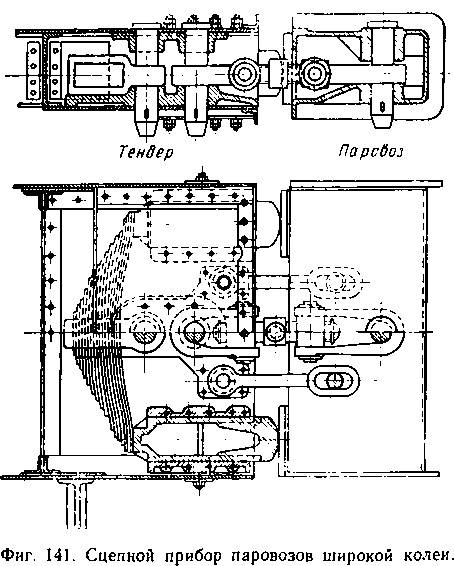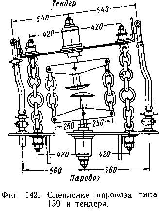 Устройство сцепления узкоколейного паровоза типа 159 с тендером показано на фиг. 142 (при прохождении по кривой).