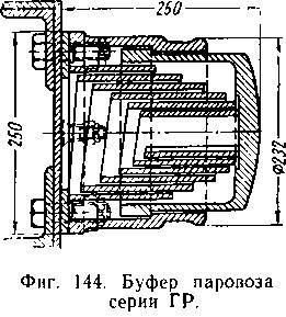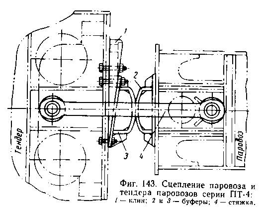 На паровозах серии ГР и ОП-2 сцепление между паровозом и тендером осуществляется жесткой стяжкой, представляющей собой стальную поковку с двумя проушинами по концам для шкворней. Смягчение ударов обеспечивается буферной пружиной, помещенной внутри центрального буфера тендера (фиг. 144). Одно отверстие в стяжке сделано продолговатое, чем обеспечивается возможность игры между паровозом и тендером на величину сжатия пружины.