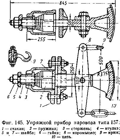 Упряжные приборы узкоколейных паровозов типа 157 и 159 состоят из одного центрального буфера и цепей (фиг. 145). Внутри буферного стакана 1 помещена листовая спиральная пружина которая одним концом опирается на шайбу 7, другим на втулку 4. Через отверстия муфты, шайбы, пружины и втулки вставляется буферный стержень 3. На хвостовик буферного стержня надевается шайба 5 и навинчивается гайка 6. Буфер узкоколейных паровозов одновременно служит тяговым прибором. Для этого на стержне буфера укрепляется коромысло 5, на одном конце которого укрепляется крюк 9, а на другом — цепь 10.