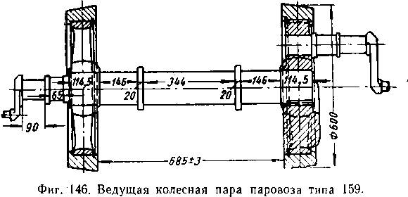 ные центры. Колесные центры напрессовываются на ось так, чтобы пальцы кривошипов одной колесной пары располагались под углом 90° друг к другу. Давление запрессовки у паровозов узкой колеи 60—84 г при надетых бандажах и 55—78 т без бандажей. Натяг для запрессовки 0,18—0,21 мм. Для предупреждения провертывания и для точной установки колесных центров на оси служит шпонка.